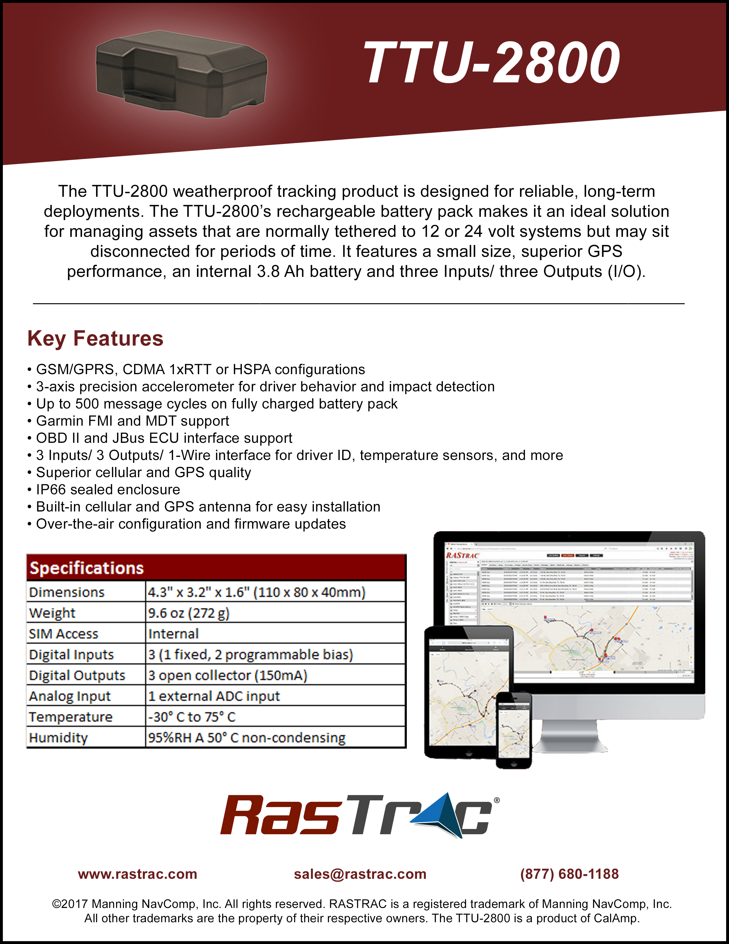 The weatherproofed TTU-2800 is specifically built for reliable, long-term tracking deployments for an individual asset. While the TTU-2800 can draw power from an attached source, it also has a built-in rechargeable battery pack—making it ideal for managing assets that are normally tethered to 12 or 24-volt power systems but may sit disconnected for set periods of time, such as cargo trailers or rental equipment.
